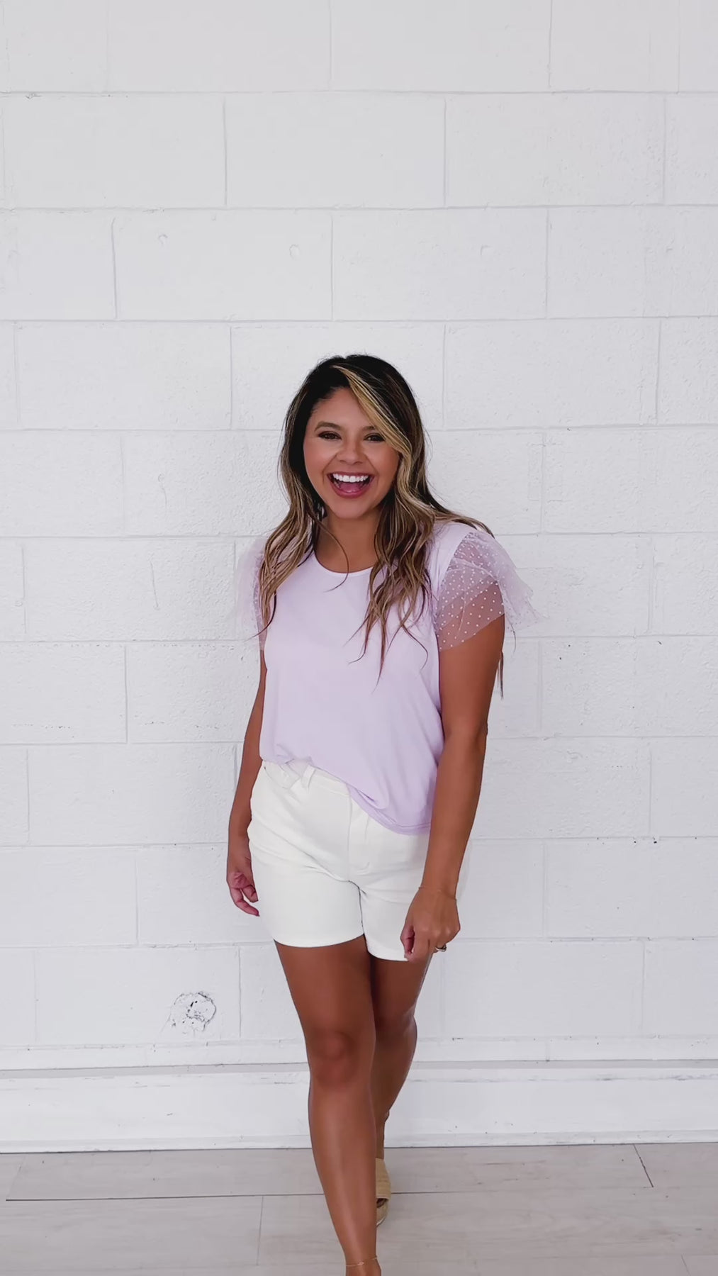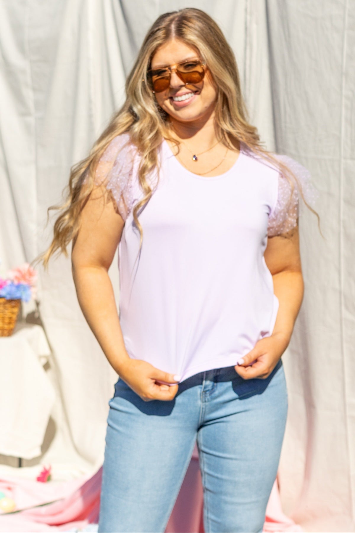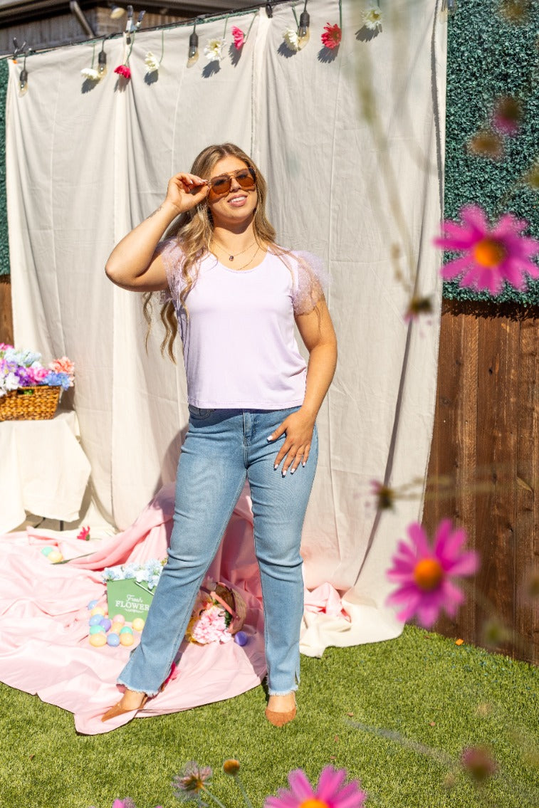 This Tulle Sleeve Top features delicate tulle flutter sleeves with a polka dot texture. The crew neck and high stretch fabric offer comfort and flexibility, while the unlined design ensures it's lightweight and breathable, perfect for layering or wearing alone.