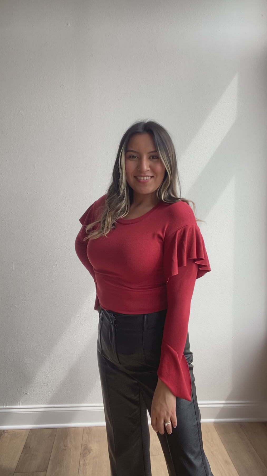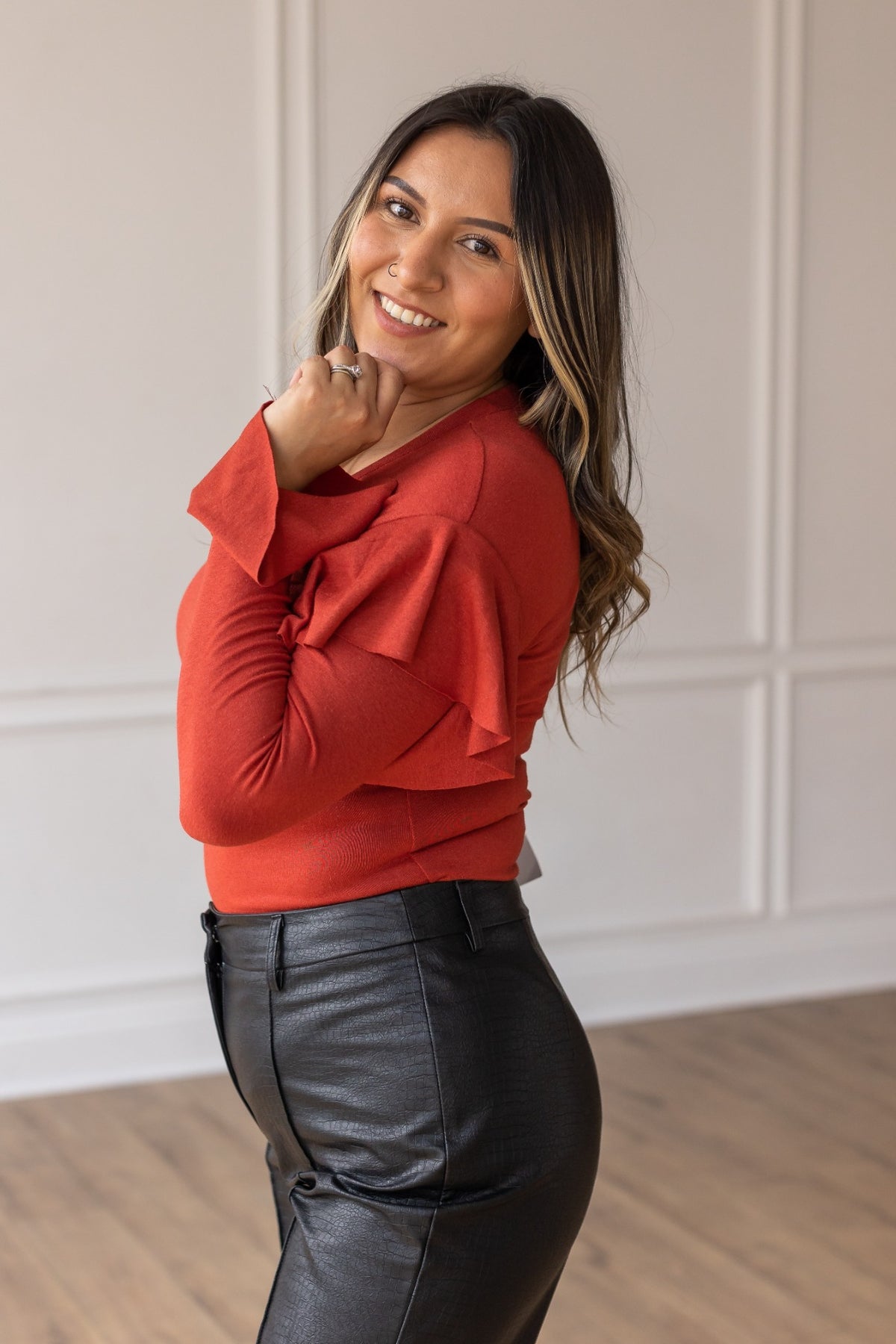 The bodysuit offers a flattering fit that hugs your silhouette, accentuating your curves in all the right places. Its versatile design makes it suitable for a range of occasions – from daytime gatherings to evening events. The rich rust color reflects the earthy tones of autumn, making it an ideal choice for seasonal fashion.